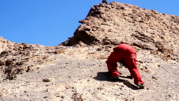 En Caliche: Sangre y Muerte, la artista asciende una torta de ripio —residuo de la actividad minera— que se confunde con los cerros naturales del desierto. Vestida con un overol rojo, bajo el sol intenso del mediodía, rompe rocas con sus manos, exponiendo el esfuerzo físico, el agotamiento y la fragilidad del cuerpo frente a la inmensidad árida del paisaje. La acción, simple y obstinada, revela las huellas invisibles del extractivismo y sus violencias persistentes. El gesto de escalar y fragmentar el material mineral se vuelve una forma de diálogo con la tierra: un intento de tocar, abrir y resistir la dureza del territorio.