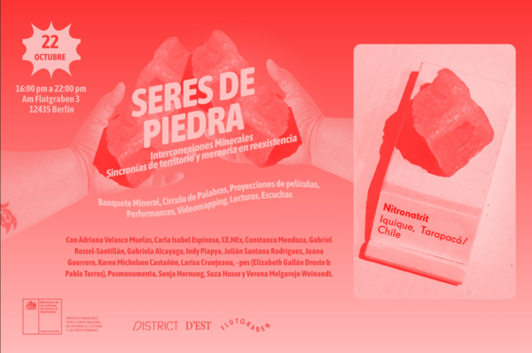 Seres de Piedra ~ Interconexiones Minerales. Sincronías de territorio y memoria en reexistencia es un programa organizado por district*school without center y D’EST en Flutgraben e.V. para celebrar la coincidencia de dos cosmos relacionados con los seres de piedra y las interconexiones minerales: